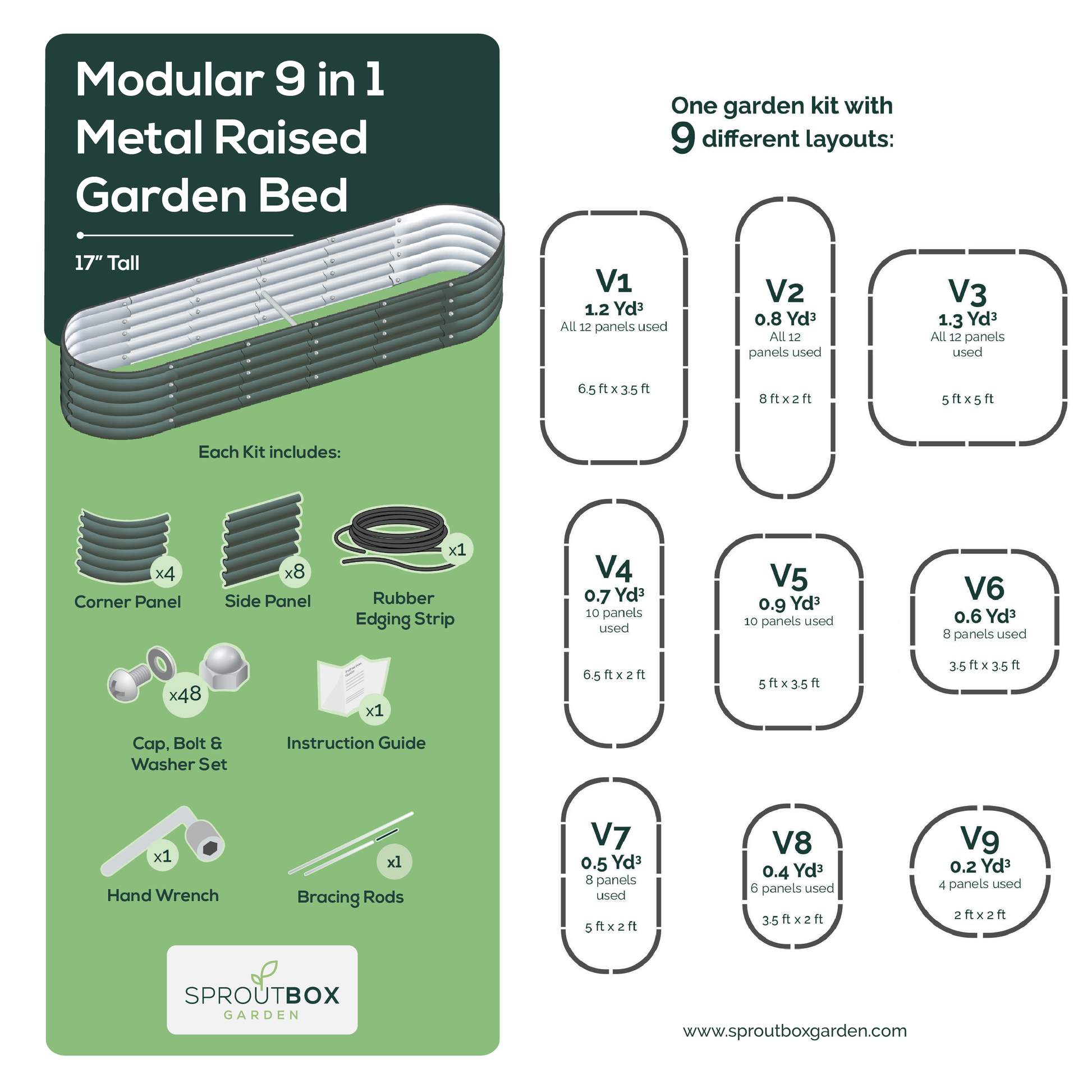 This kit highlights the advantages of modular gardening. Included, are 8 side panels and 4 corner panels. Our Sproutbox panels are uniformly designed to fit together in no particular order. This gives you the autonomy to configure the panels in the orientation specific to your dreams. See configuration guide for the 9 orientations this kit can provide.