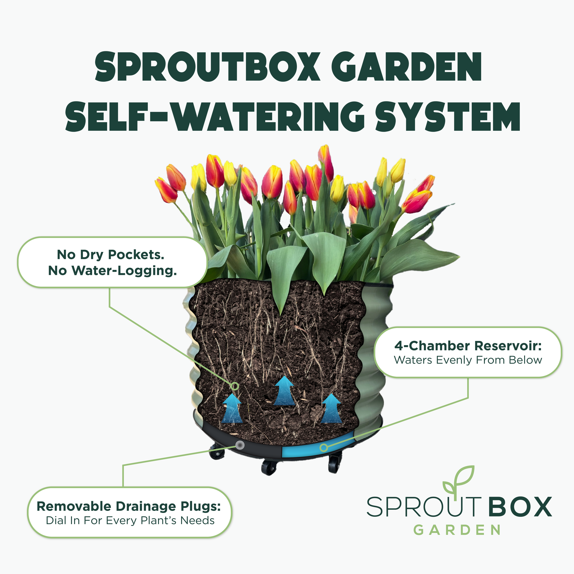The real game changer? A built-in self-watering reservoir at the bottom. Your plants and soil draw up water as needed through capillary action—meaning less frequent watering and healthier roots.